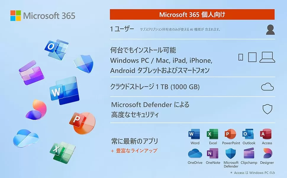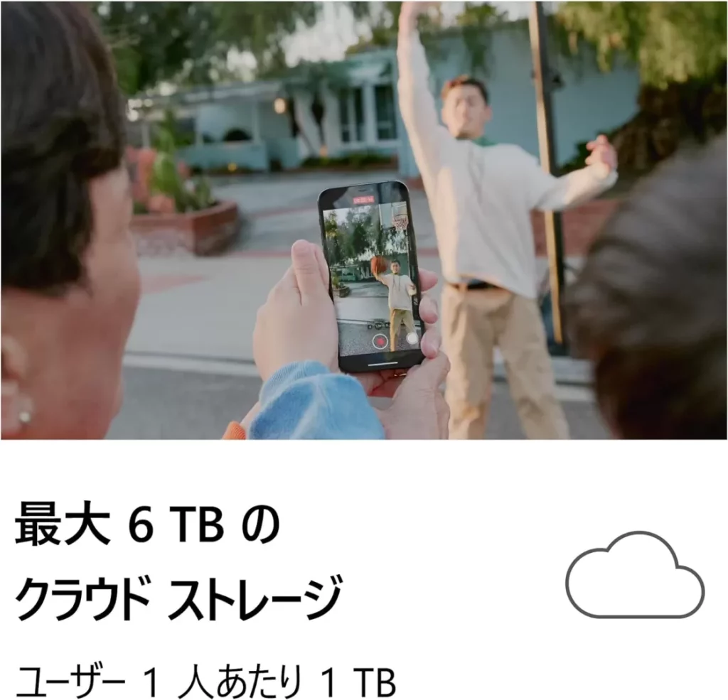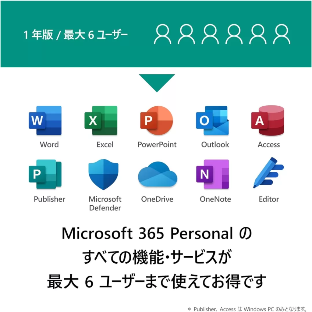 Word / Excel / PowerPoint などの主要な Officeアプリ に加え、合計6TBのクラウドストレージ OneDrive などのサービスが含まれます。このプランは家庭や中小企業での利用を想定し、PCやスマホなど複数のデバイスで利用することができます。