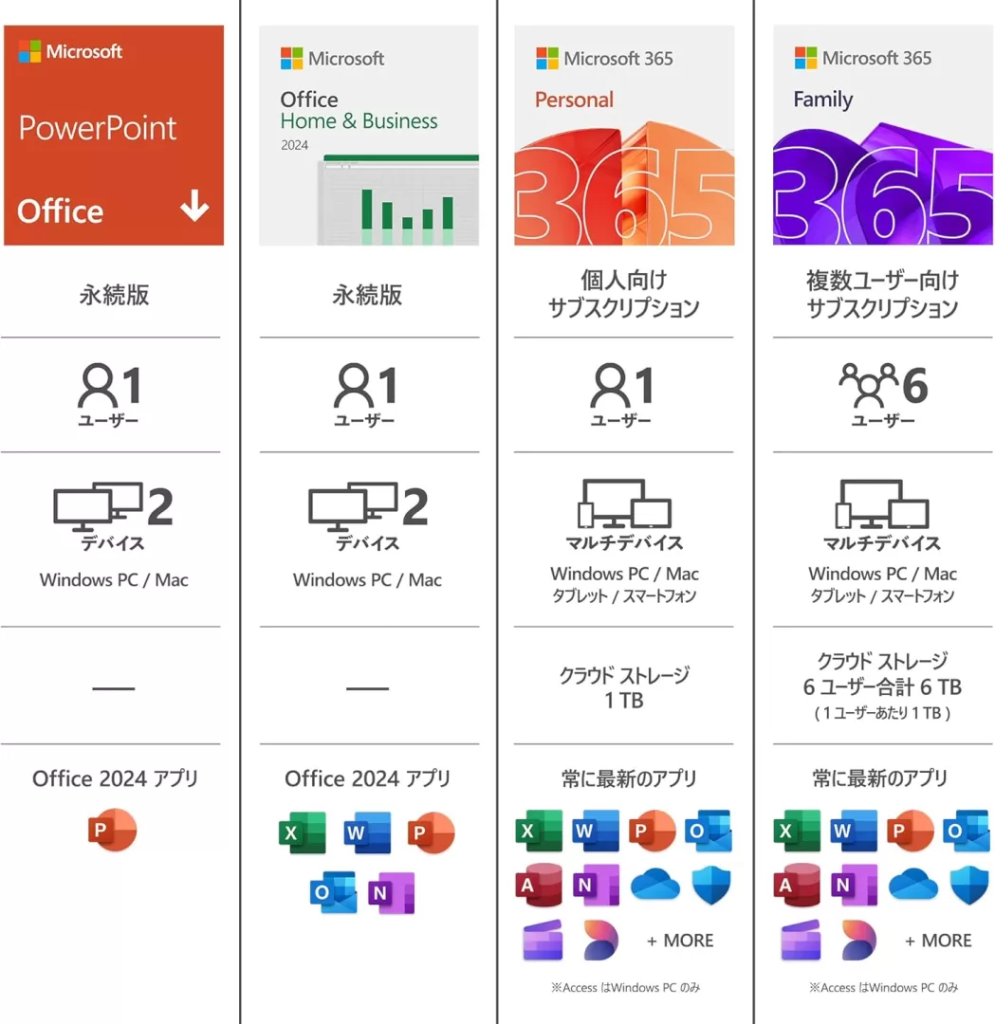 パワーポイントが含まれたオフィスは、買い切り版「 Office 2024 」とサブスク版「 Microsoft 365 」です。