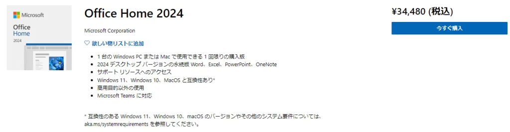 マイクロソフトの公式サイトでは、Office Home 2024 を定価 ¥34,480 で販売されています。