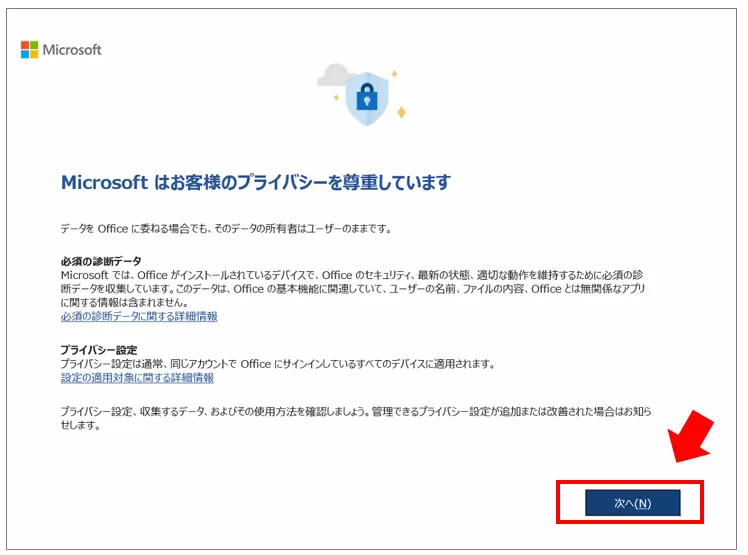 「Microsoftはお客様のプライバシーを尊重しています」等の画面が表示されたら、内容を確認し任意の項目を選択します。