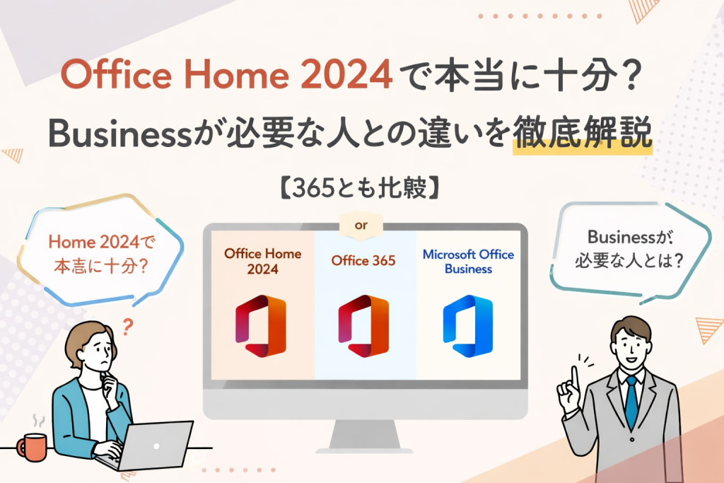 この記事では、Office Home 2024とBusinessの違いを整理しながら、Microsoft 365との比較も含めて、「結局どれを選べば損をしないのか」を分かりやすく解説します。