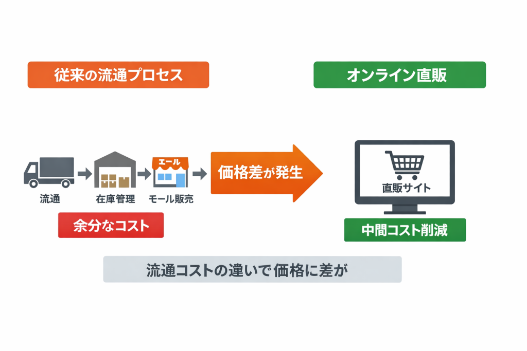 一方で、オンライン中心の販売や中間流通を抑えた形態では、コスト構造が異なるため価格差が生まれることがあります。