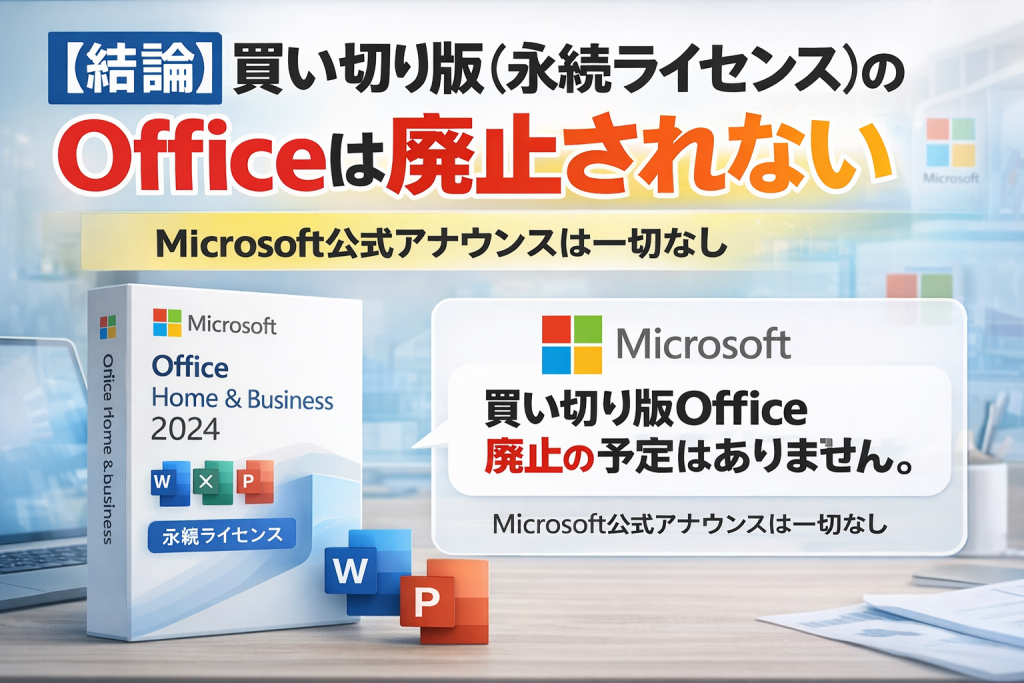 結論から申し上げますと、現時点でOfficeの買い切り版(永続ライセンス)が廃止される予定はありません。