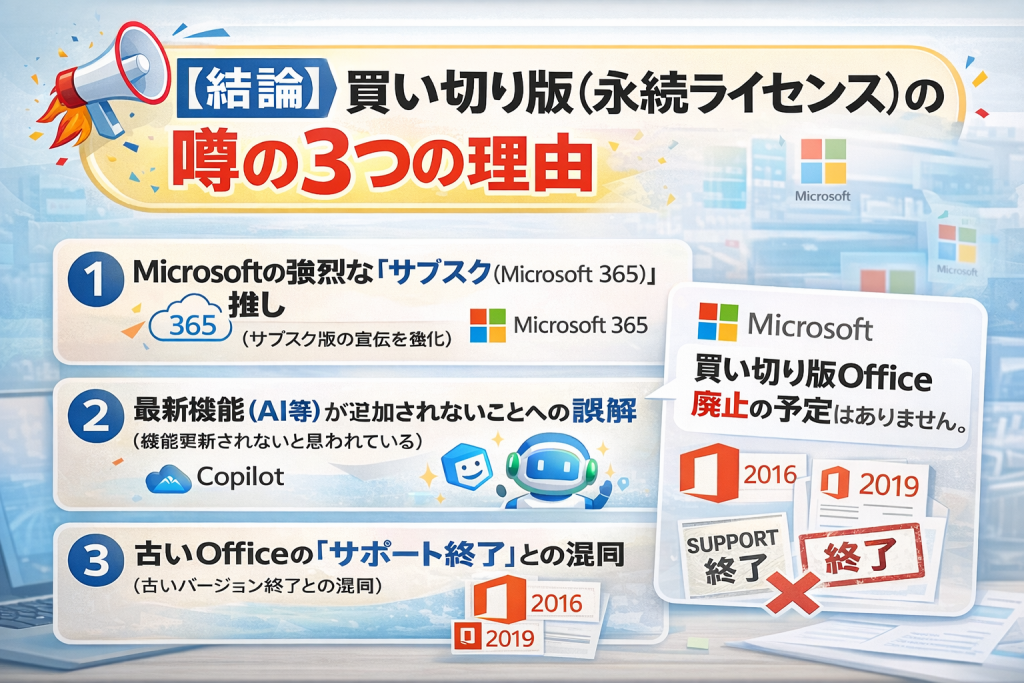 では、なぜインターネット上やSNSで「Officeの買い切り版はなくなる」「永続ライセンスは終了する」といった噂が絶えないのでしょうか? その背景には、以下の3つの理由が関係しています。