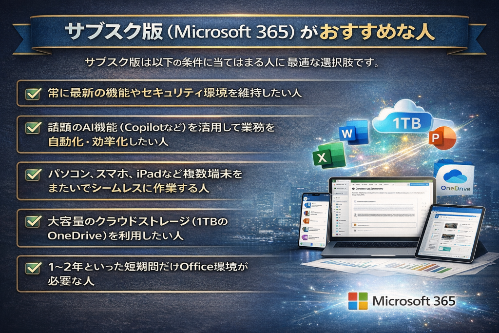 - 「複数デバイスで最新機能やAI(Copilot)をフル活用したい」 → サブスク版(Microsoft 365)