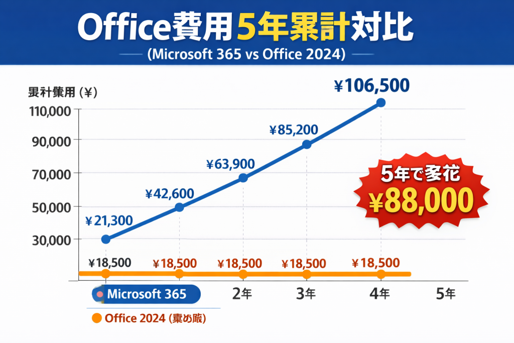 このような場合は、買い切り型の Office 2024 を選んだ方が、結果的にコストを大きく抑えられます。