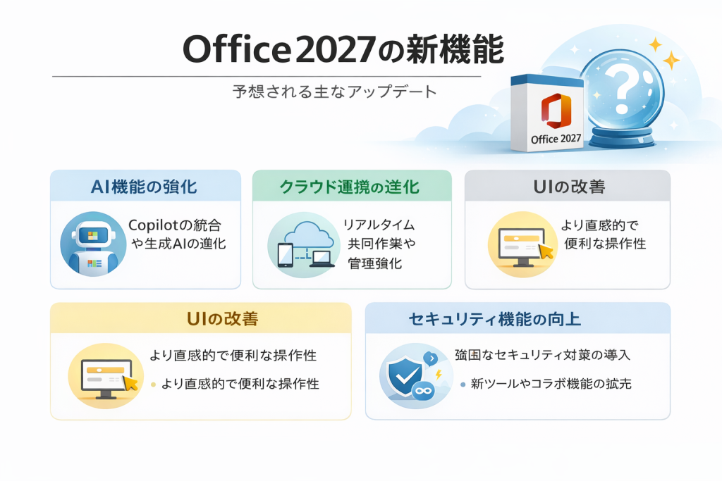 Office 2027 では、AIやクラウド連携、セキュリティ機能の強化など、現代のビジネス環境に即したアップデートが盛り込まれる可能性が高いでしょう。