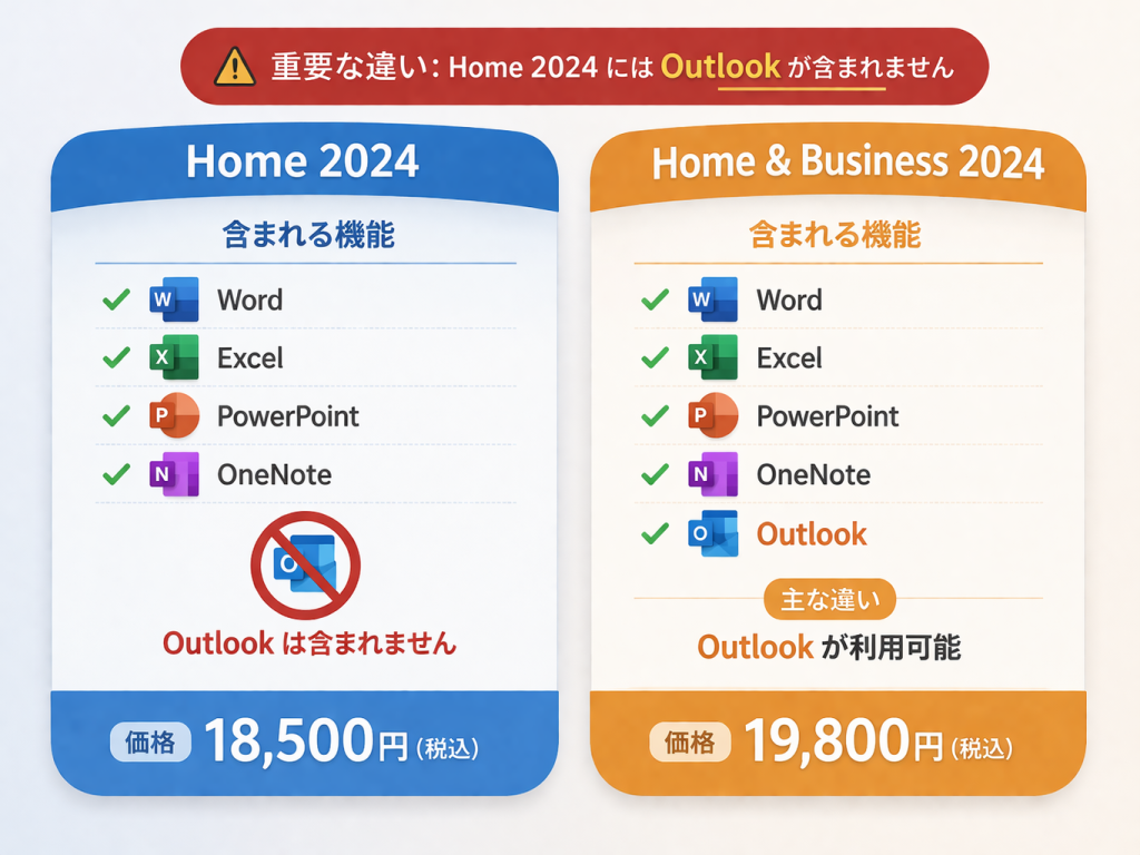 • 「Home 2024」はOutlookがない分、価格が抑えられており、両者の差はわずか約1,300円です。