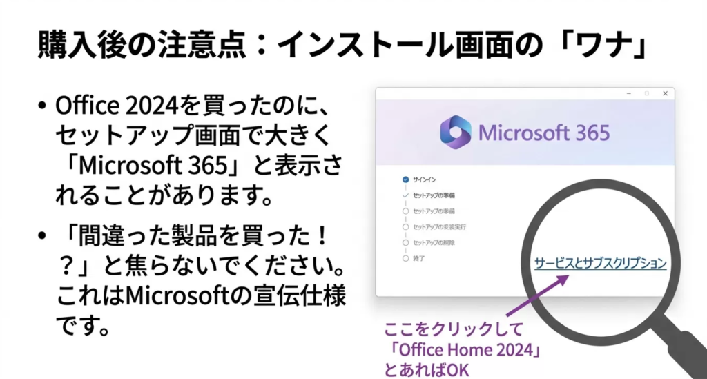 最近の仕様では、Office 2024を買ってもセットアップ画面で「Microsoft 365」という表記が大きく出ることがあります(宣伝のため)。 ここで焦らず、画面の下の方にある「サービスとサブスクリプション」という項目を確認してください。そこにちゃんと「Office Home 2024」と記載されていれば、そのままインストールして大丈夫です。