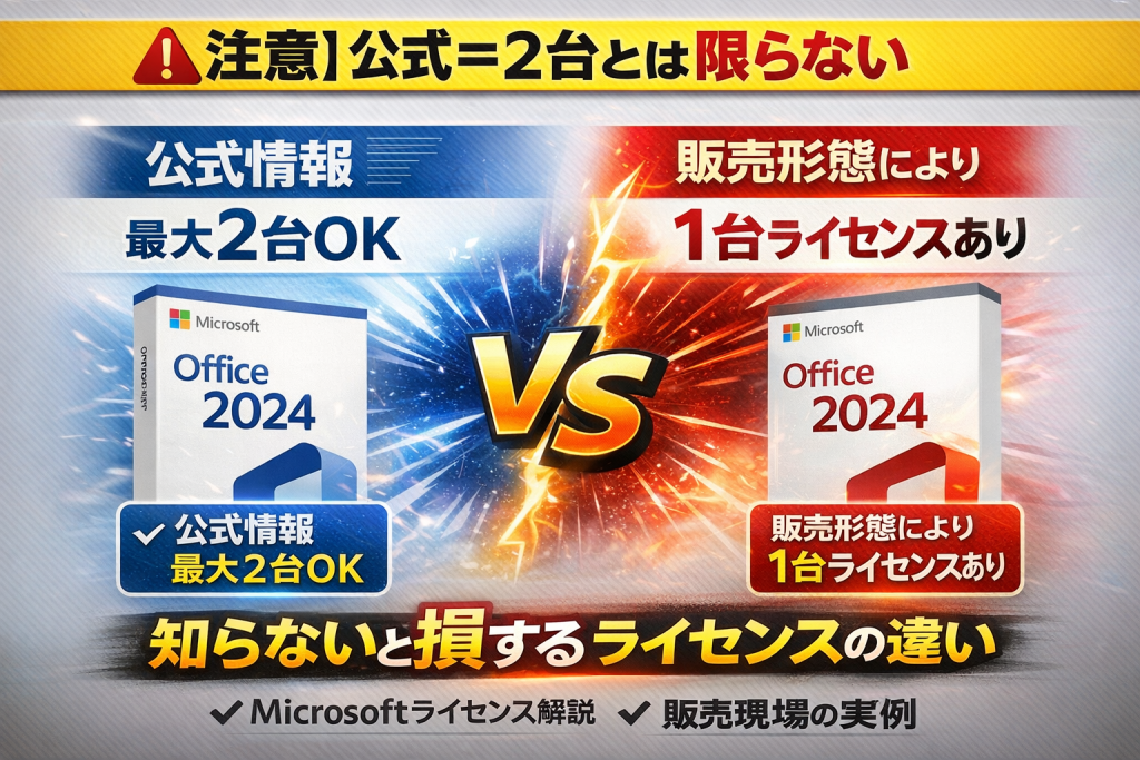 一方で、Office製品はライセンス形態の違いにより、インストール可能台数が異なる場合があります。市場には「1台のPCに対して1ライセンス」で提供されるタイプも存在しており、用途や購入形態によって条件が変わる点には注意が必要です。