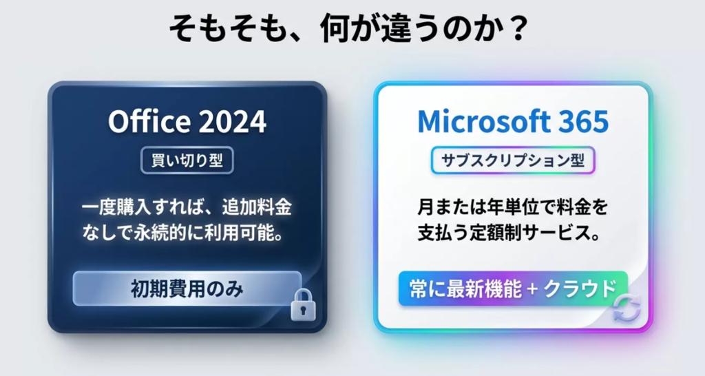 「サブスク型 Microsoft 365」 と 「買い切り型 Office 2024」 の主な違いは、次の通りです。