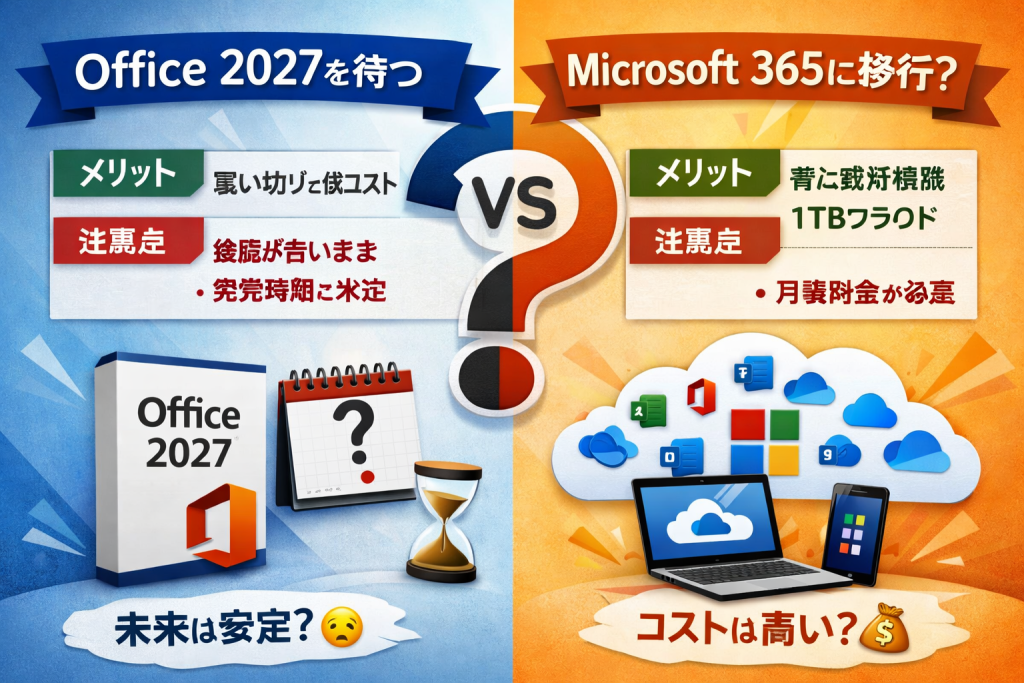 Office 2024のサポートが終了する2029年に向けて、あるいは現在すでに古いOffice(2016、2019、2021など)をお使いで買い替えを検討している方にとって、今後の移行先は大きく分けて2つの選択肢があります。