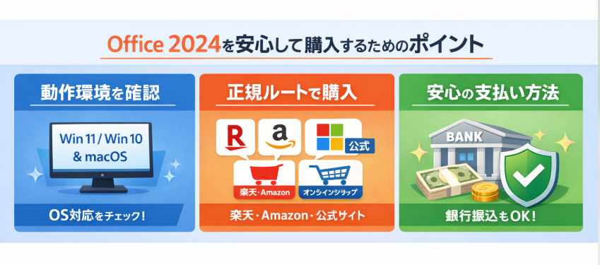 Office 2024は一度購入すれば長く使えるソフトだからこそ、購入前にいくつか確認しておきたいポイントがあります。事前にチェックしておくことで、トラブルを防ぎ、安心して利用を始めることができます。