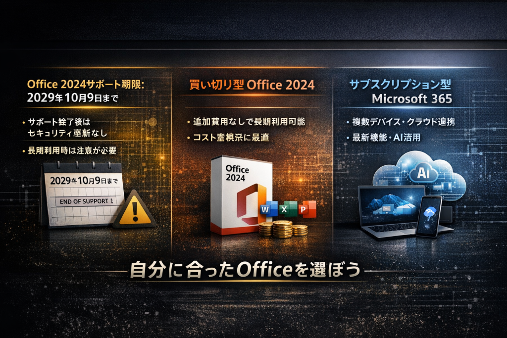 あらかじめ次の選択肢(Office 2024やMicrosoft 365)を検討しておくとスムーズです。