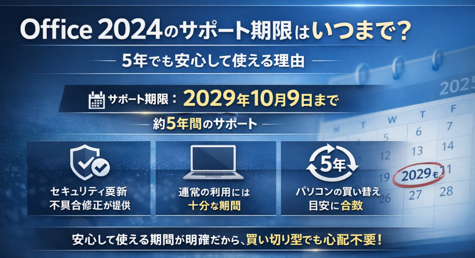 Office 2024のサポート期限は、発売日から約5年後の2029年10月9日までとなっています。