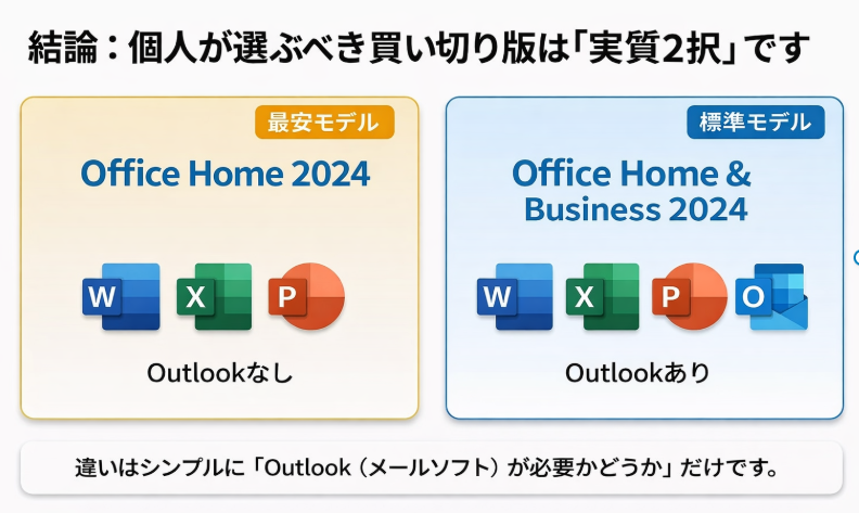 結論から言うと、個人が選ぶべき買い切り型Office 2024は実質2種類のみです。