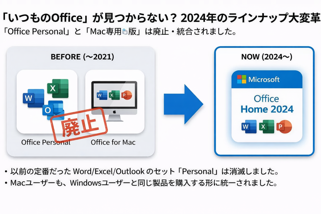 Office Personal 2024は存在しません。2024年版からラインナップが刷新され、Word・Excel・PowerPointがセットになった『Office Home 2024』が実質的な後継製品として統合されました。