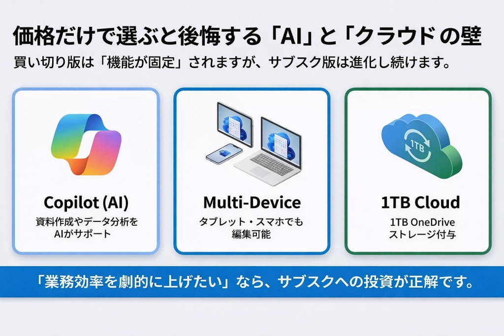 - 「iPadでも編集したい」「1TBのクラウドストレージが欲しい」という方は、サブスク版(Microsoft 365)の方がメリットが大きくなります。