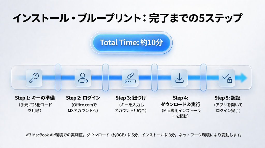 MacBookにOffice 2024(買い切り版)をインストールし、実際に使い始めるまでの全体像は以下の通りです。結論として、この5つのステップを順番に行えば完了します。