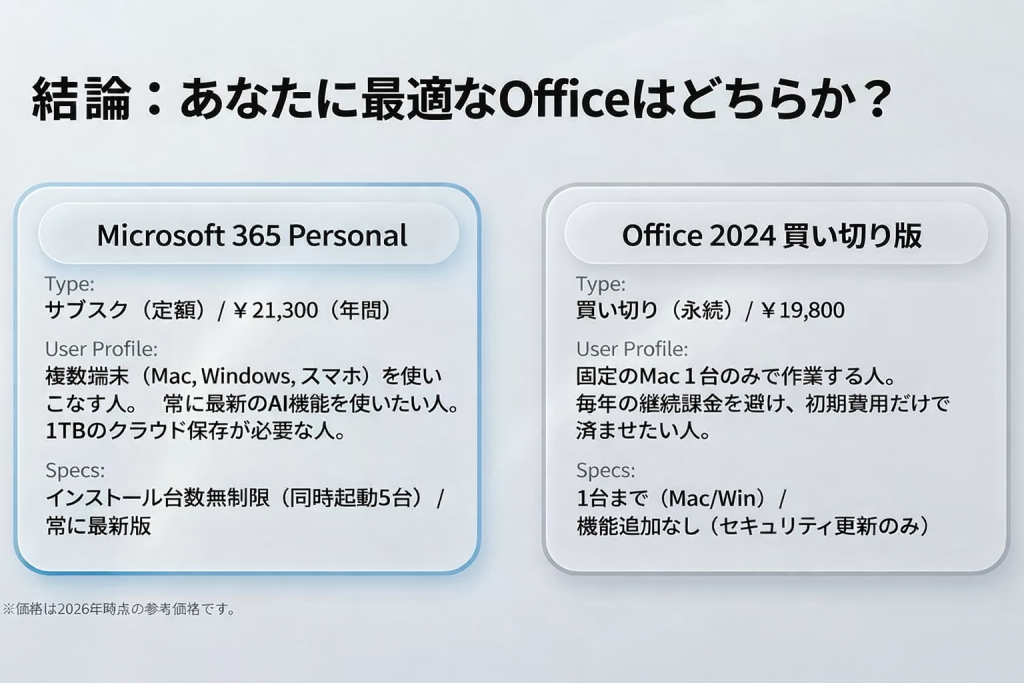 「MacでOfficeを使いたいけれど、1回払いの買い切り版(Office 2024)と、月額・年額制のサブスク版(Microsoft 365)のどちらを選べばいいか分からない…」という方は非常に多いです。