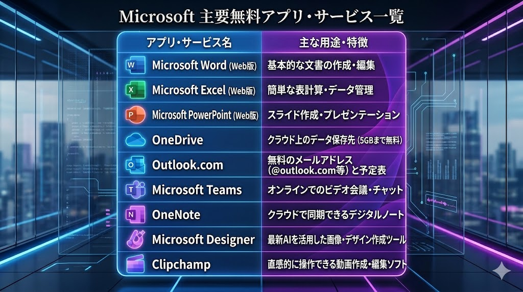 無料で利用可能な主なMicrosoftアプリとそれぞれの用途は以下の通りです。
