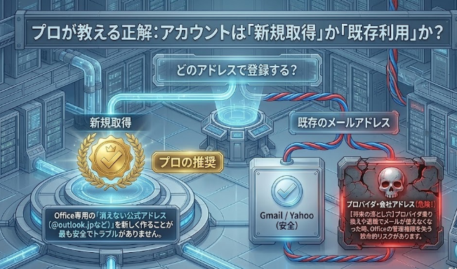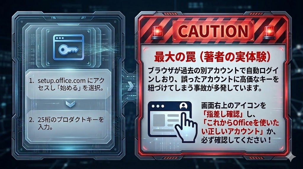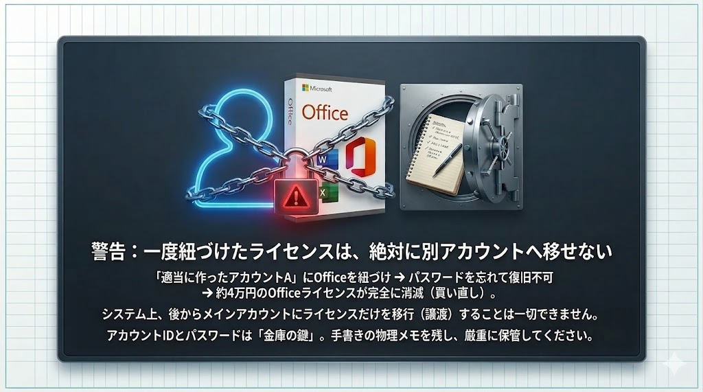 これが最大の注意点です。例えば「適当に作ったアカウントA」に約2万円のOffice 2024を紐づけたとします。その後、アカウントAのパスワードを忘れ、復旧もできなくなってしまった場合……最悪の場合、Office 2024のライセンスごと消滅(買い直し)になります。