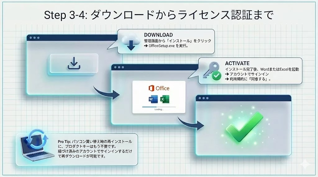 インストールから初期設定(ライセンス認証)までの流れは、以下の3ステップで完了します。
