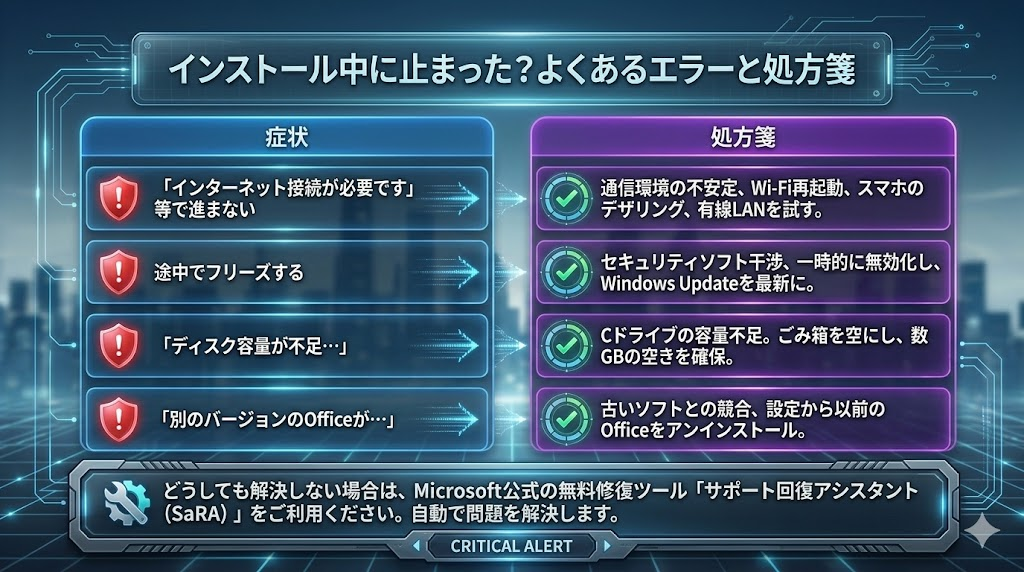 Officeのインストール中にエラーメッセージが表示されたり、途中で進行が止まってしまったりする場合は、焦らずに原因を特定しましょう。