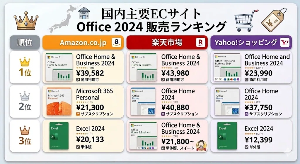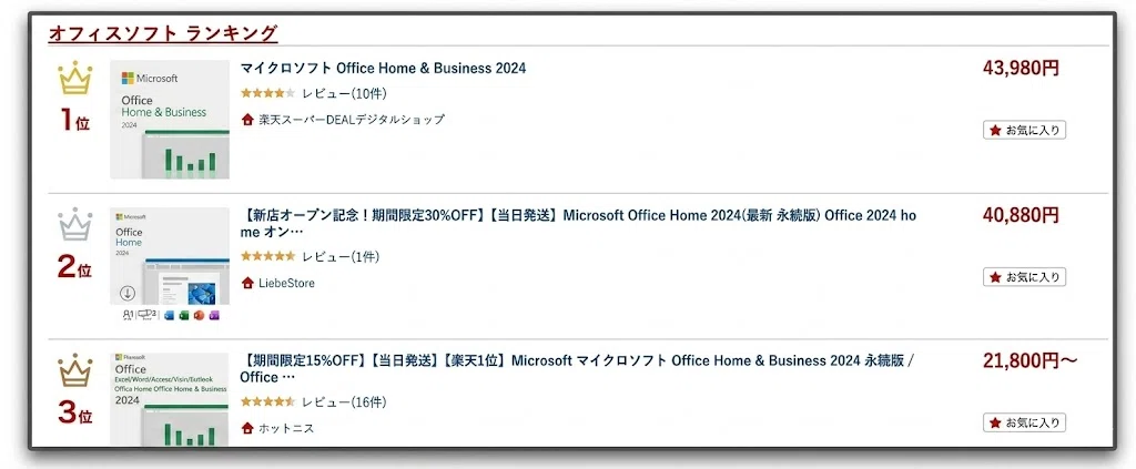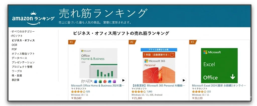今回、Amazon・楽天・Yahooのランキングを比較すると、最も安定して上位に入っているのは「Office Home & Business 2024」であり、多くの人が買い切り型を選んでいることが分かります。