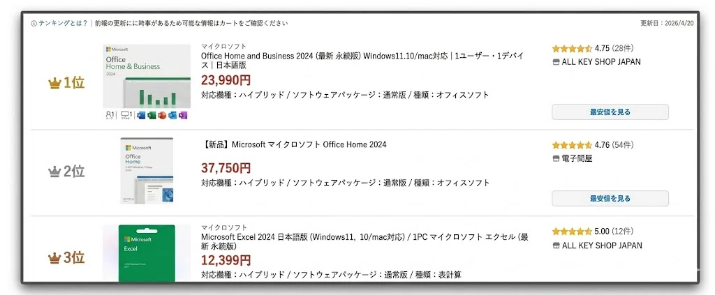 こちらは、2026年4月20日時点での「オフィスソフト売れ筋ランキング」の一部です。あえて同じタイミングでAmazon、楽天、Yahoo!ショッピングの3つのサイトを見比べてみると、ある共通点に気づきます。