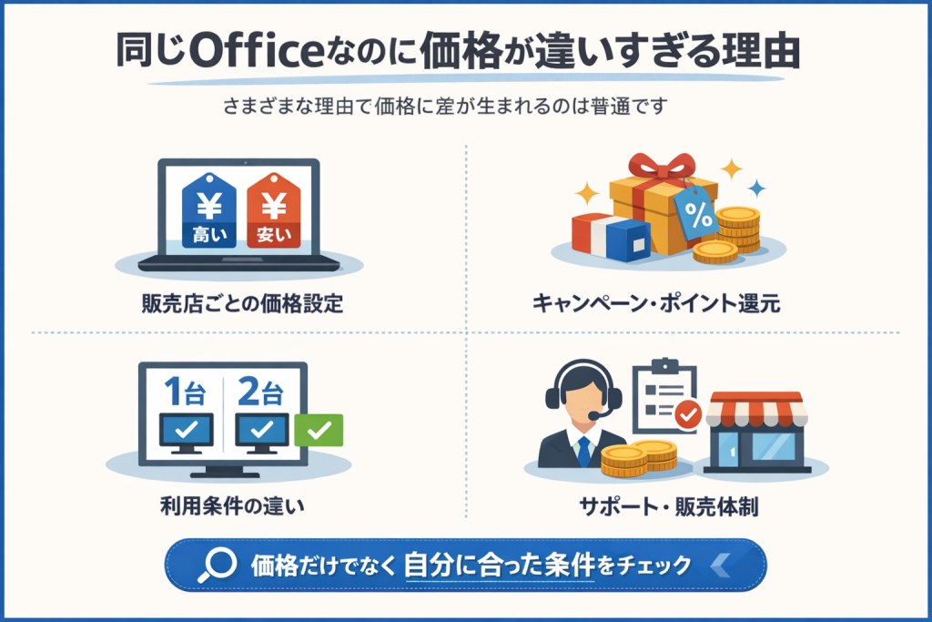 Officeの価格差は、販売店ごとの価格設定やキャンペーン、利用条件(インストール台数など)の違いによって生まれています。特別なものではなく、現在の市場では一般的な傾向です。重要なのは価格の高低ではなく、自分の使い方に合っているかどうかです。