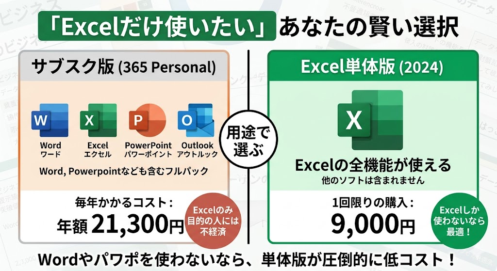 実際、データ管理や表計算が中心のユーザーにとっては、WordやPowerPointまで含めたフルパッケージを購入する必要はなく、必要なソフトだけを選ぶ方が合理的です。