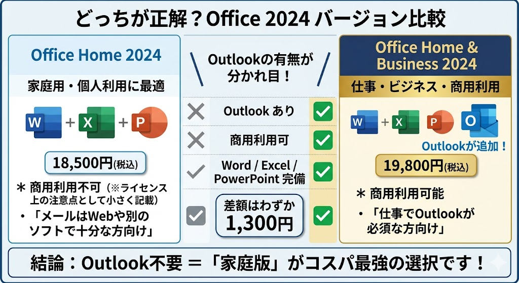 個人利用であれば、Word・Excel・PowerPointが使えるHomeモデルで十分対応できます。仕事用途まで考える場合は、Outlookを含むHome & Businessモデルの方が安心です。また、Excelのみを使用する場合には、単体版を選ぶことで無駄なコストを抑えることができます。