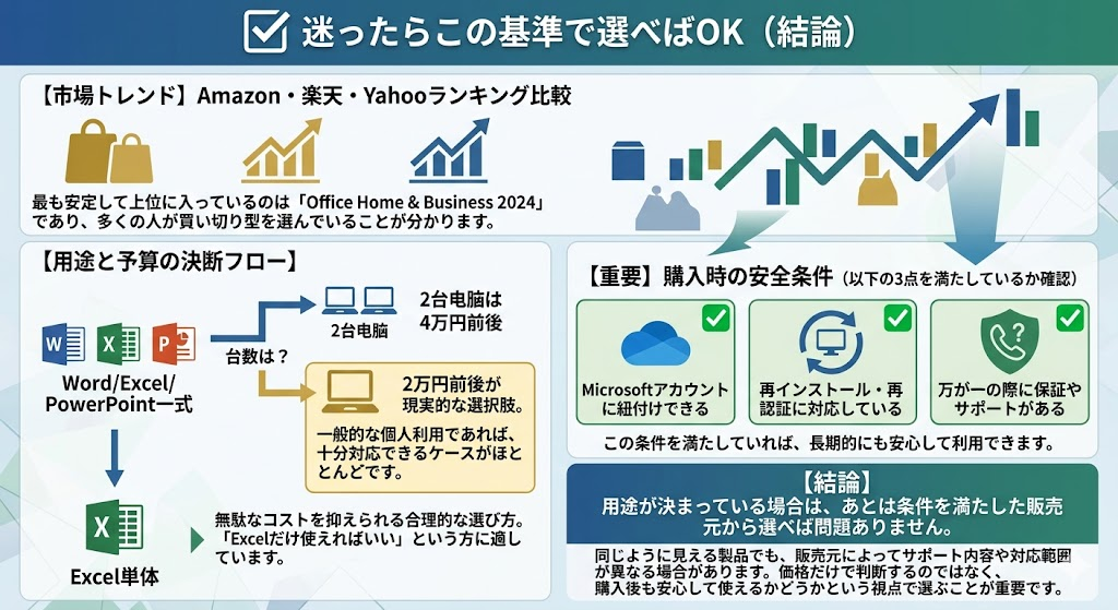 ここまで見てきたように、Officeは価格だけで安全性を判断することが難しい製品です。そのため、購入時には「価格」ではなく「利用条件」に注目することが重要です。