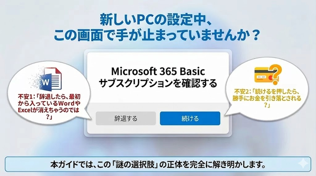 新しいパソコンの初期セットアップ中、突然「Microsoft 365 Basic サブスクリプションを確認する」という画面が表示され、「辞退する」「続ける」のどちらを選ぶべきか迷っていませんか?