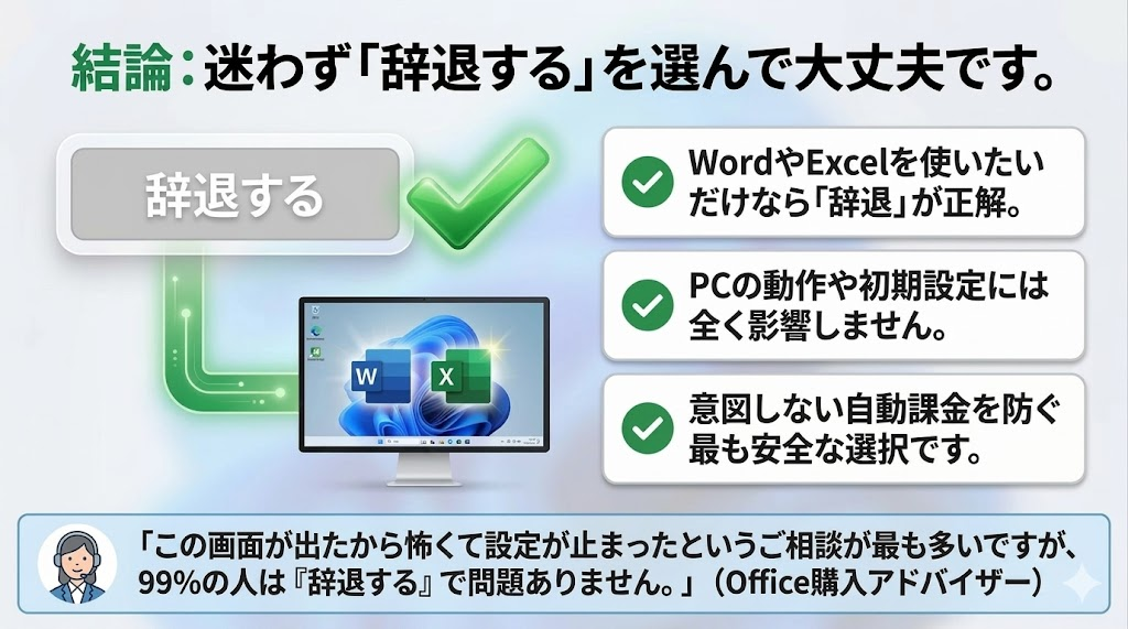 「辞退する」を選んでも、パソコンの動作がおかしくなったり、初期設定が失敗したりすることはありません。不要なサブスクリプション契約を防ぐための、最も安全で一般的な選択肢です。