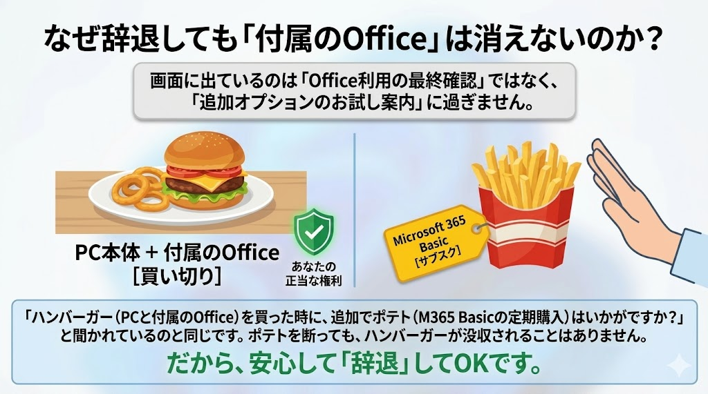 「ハンバーガー(PCと付属のOffice)を買った時に、追加でポテト(Microsoft 365 Basic)の定期購入はいかがですか?」と聞かれているようなイメージです。ポテトを断っても、ハンバーガーが没収されることはありませんよね。