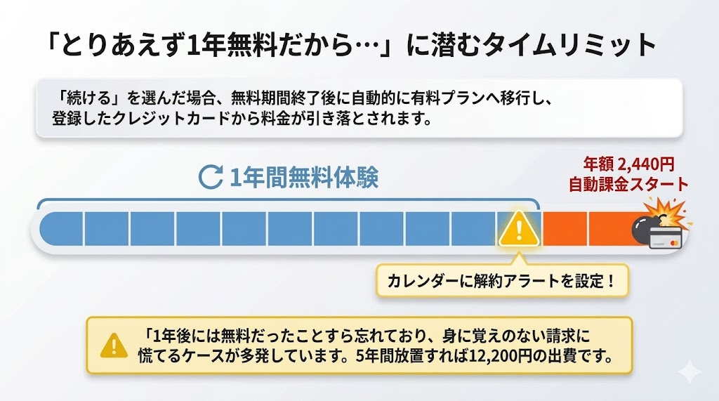 👉 パソコン付属の「1年間無料」で始めた場合、1年経過すると自動的にクレジットカード等から年会費(2,440円)が引き落とされます。