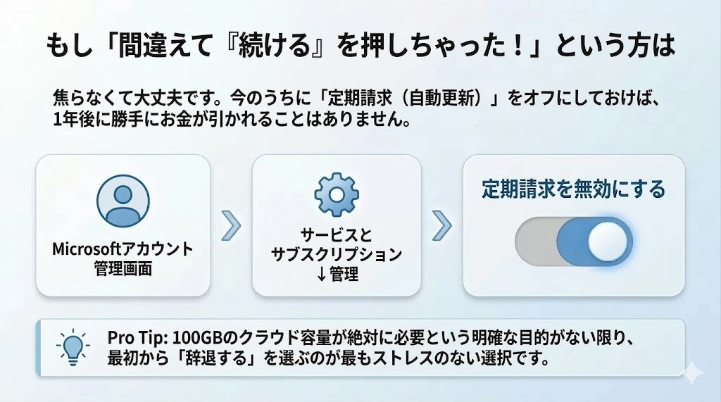 もし「絶対に100GBのクラウドが必要だ!」という明確な目的がないのであれば、最初から「辞退する」を選んでおくのが最も安全でストレスのない選択です。