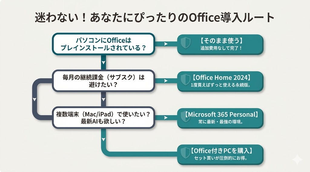 すでにパソコンをお持ちの方に向けた「サブスク版」「買い切り版」と、これからパソコンを買う方に向けた「Office付きパソコン」の3つの選択肢をプロの視点で解説します。