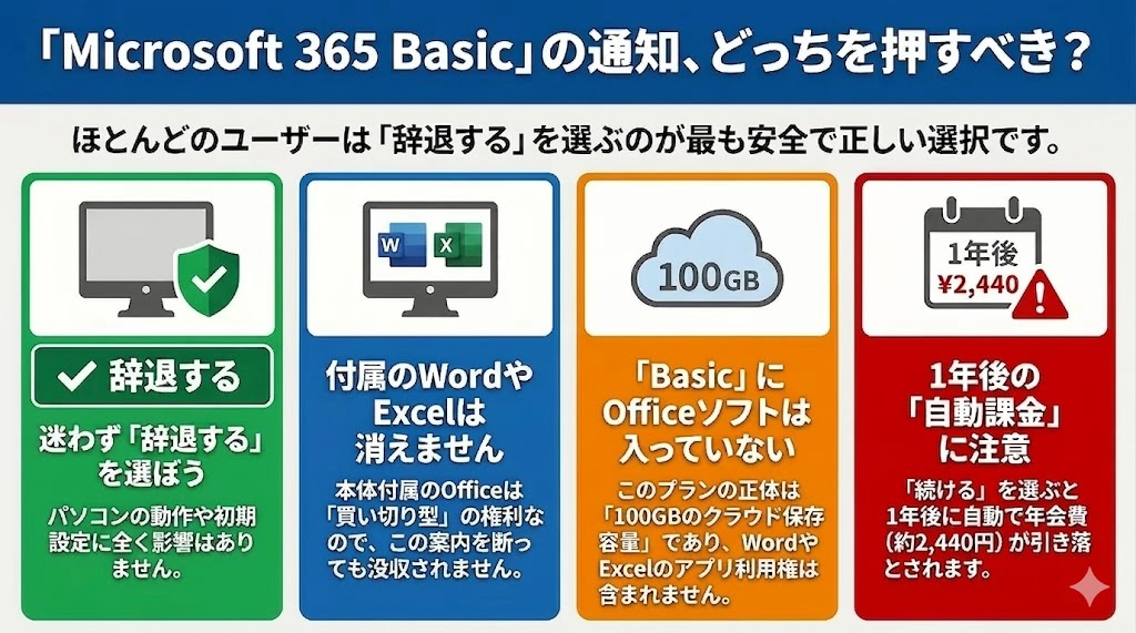 「Microsoft 365 Basic」辞退でOK?続けると課金される?違いと正しい選び方