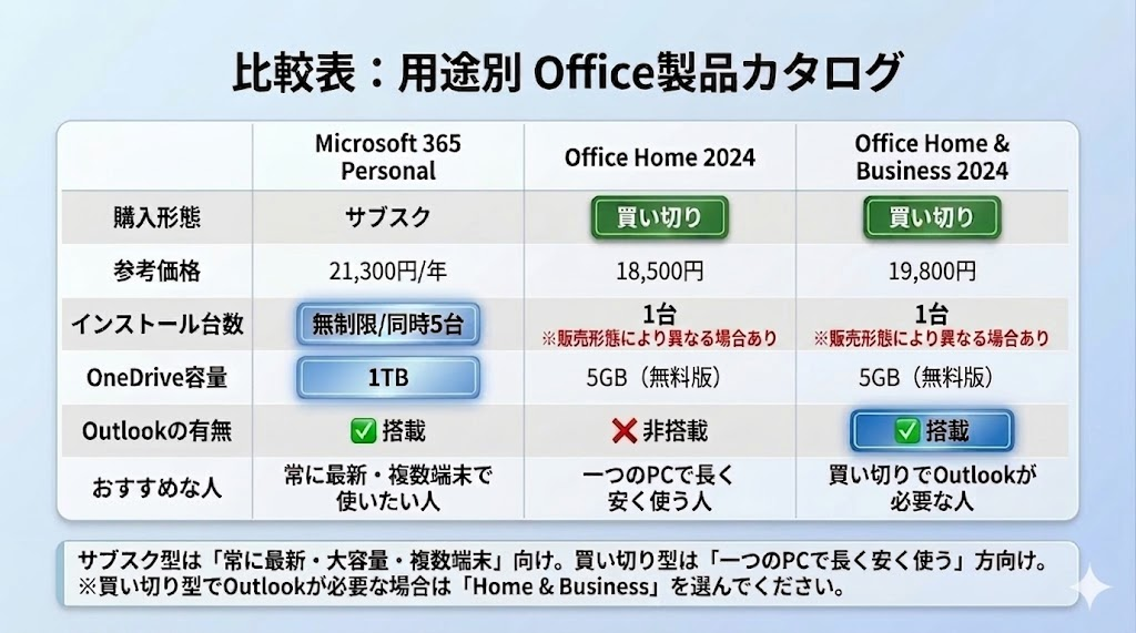 迷ったら → 「安く長く使うならOffice 2024、機能重視ならMicrosoft 365」