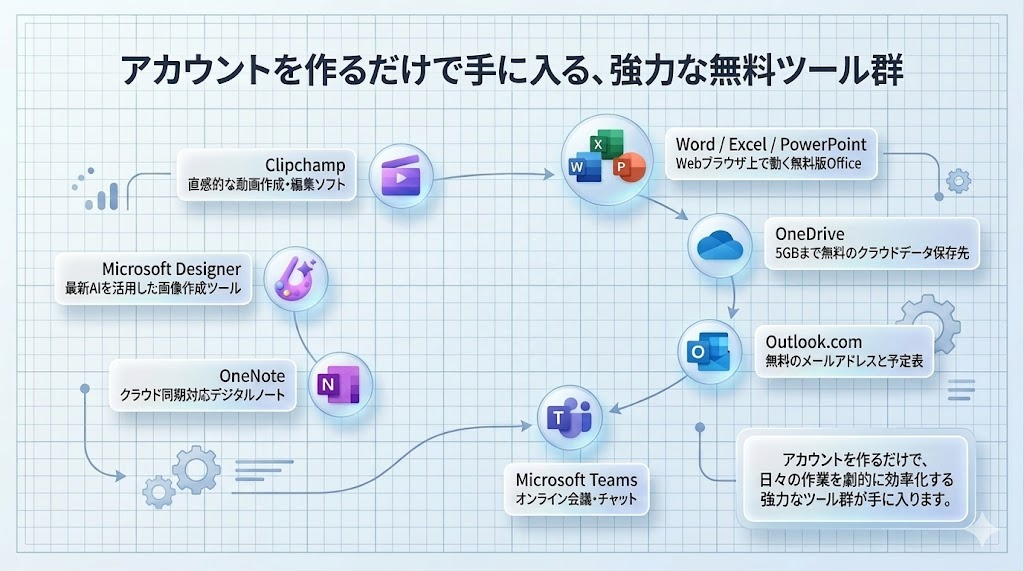 このように、Microsoftアカウントを作成するだけで、日々の作業やデータ管理を劇的に効率化する強力なツール群を無料で手に入れることができます。