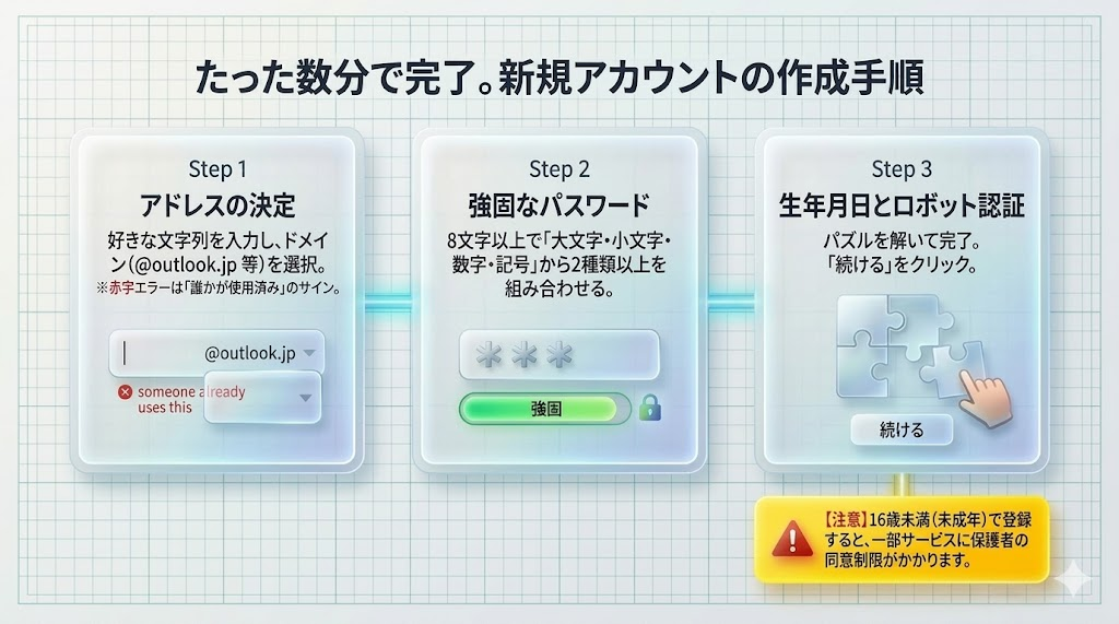 - 方法①: 新しいメールアドレス(@outlook.comなど)を無料で取得して作成する