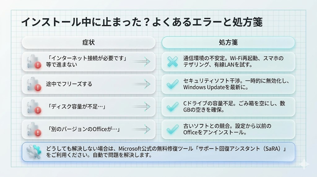 Officeのインストール中にエラーメッセージが表示されたり、途中で進行が止まってしまったりする場合は、焦らずに原因を特定しましょう。