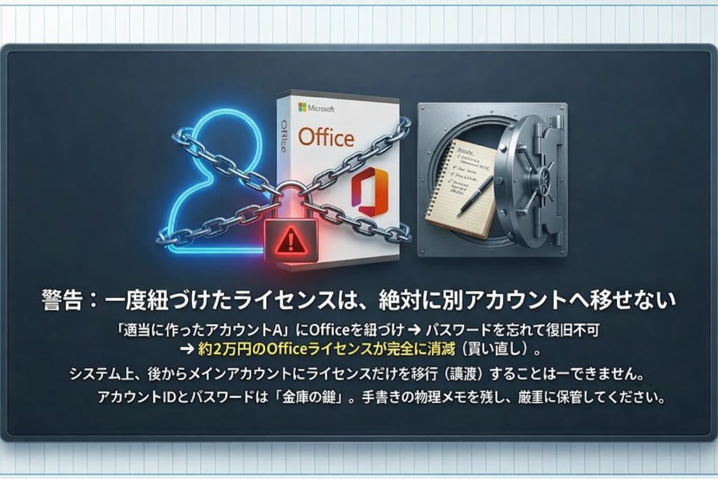 これが最大の注意点です。例えば「適当に作ったアカウントA」に約2万円のOffice 2024を紐づけたとします。その後、アカウントAのパスワードを忘れ、復旧もできなくなってしまった場合……最悪の場合、Office 2024のライセンスごと消滅(買い直し)になります。