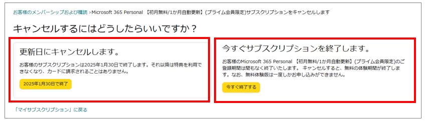 すぐに解約するなら「今すぐサブスクリプションを終了します。」