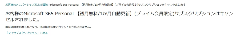 お客様のMicrosoft 365 Personal 【初月無料/1か月自動更新】(プライム会員限定)のご登録期間は間もなく終了いたします。 キャンセルすると、無料の体験期間が終了します。なお、無料体験版は一度しかお申し込みができません。