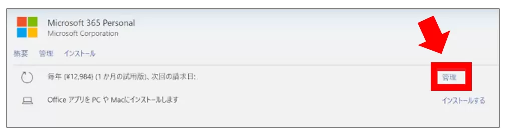 解約する Microsoft 365 のプランを選択し「管理」をクリックします。