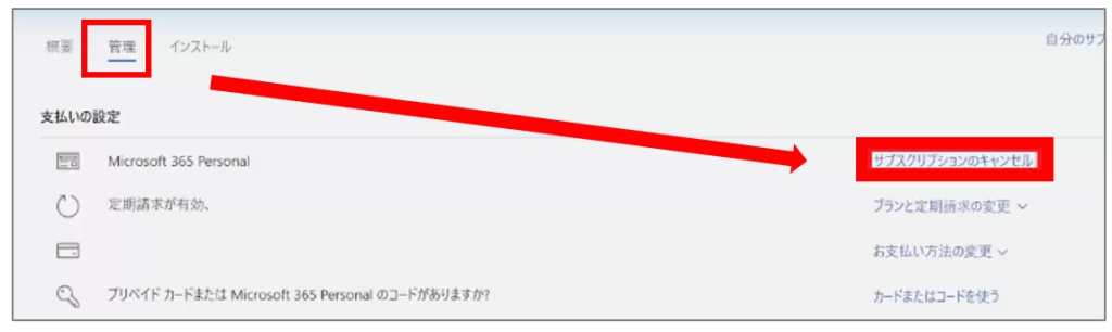 「管理」の画面が表示されたら「サブスクリプションをキャンセル」を選択します。